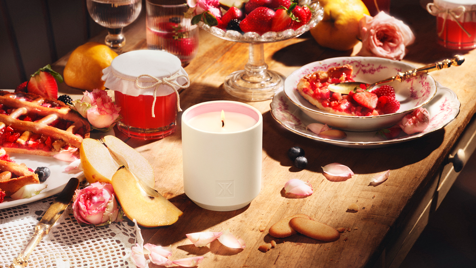 La bougie Anouche est un souvenir d’enfance délicatement préservé. Son univers s’inspire du petit appartement des grands-parents de Francis Kurkdjian. La lumière y est tendre, presque poudrée, caressant des matières simples et chaleureuses. Dans l’air flotte un parfum suave et fleuri : celui d’une confiture de pétales de rose.