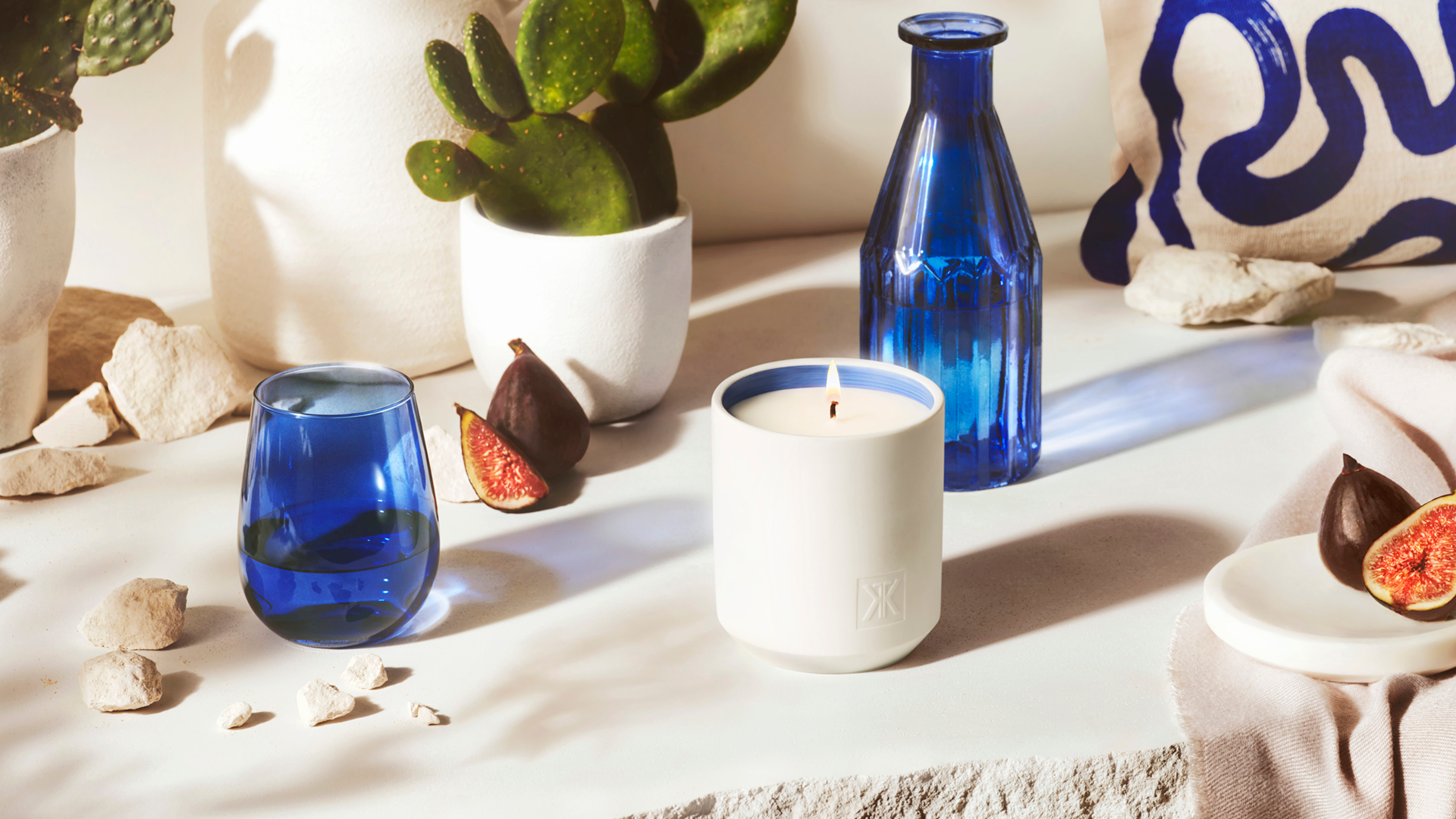 La bougie Es Cap retranscrit l'odeur d'un figuier et évoque une échappée vers le sud de Formentera, dans une maison blanche posée face à l’horizon. Le décor baigné d’une lumière chaude, caresse les murs et prolonge l’été. Des touches de bleues font écho au ciel éclatant et à la mer infinie.